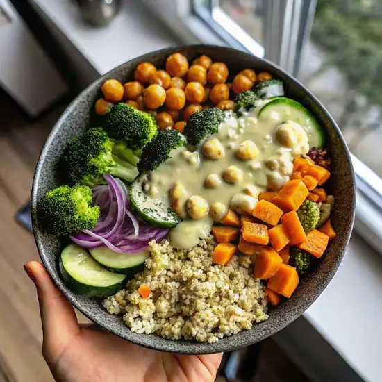 Wholesome vegan bowls with quinoa, roasted vegetables, chickpeas, and a creamy tahini drizzle. Fresh, colorful, and satisfying.